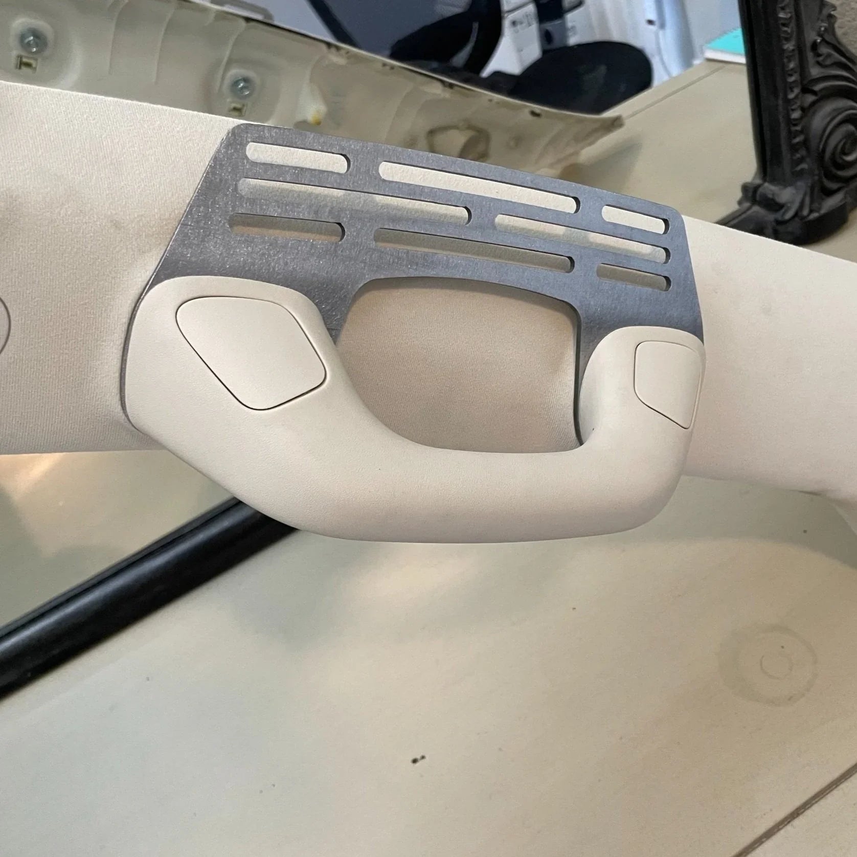 Plate is easily mounted between the grab handle and A-Pillar for a solid surface to attach accessories. Simply remove the handle screws and reinstall with the mount under the handle. Handles must be installed properly to match the profile of the plates. This does not obstruct the use of the grab handles or affect side curtain air bag deployment.