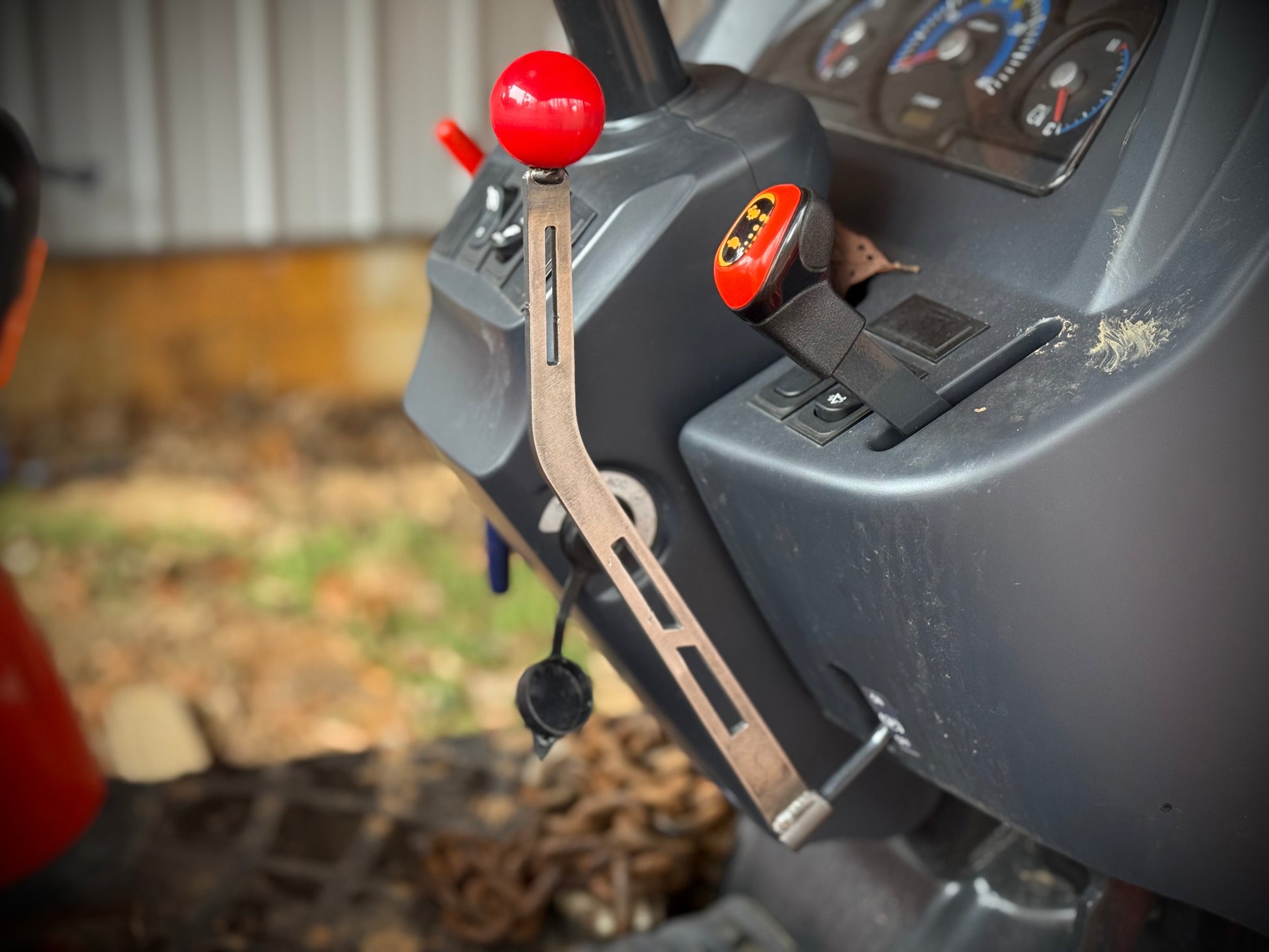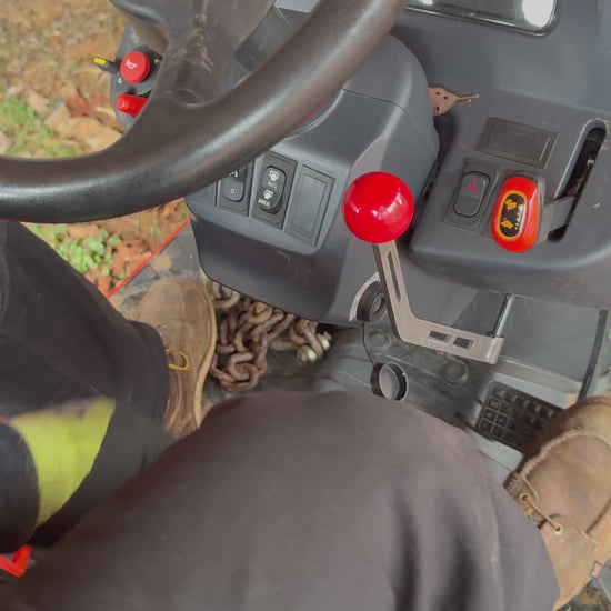 When you are doing work that requires getting off and on the tractor a lot, reaching down for the parking brake over and over can become annoying. We have developed an extension that puts the controls higher up on the dash for better ergonomics.