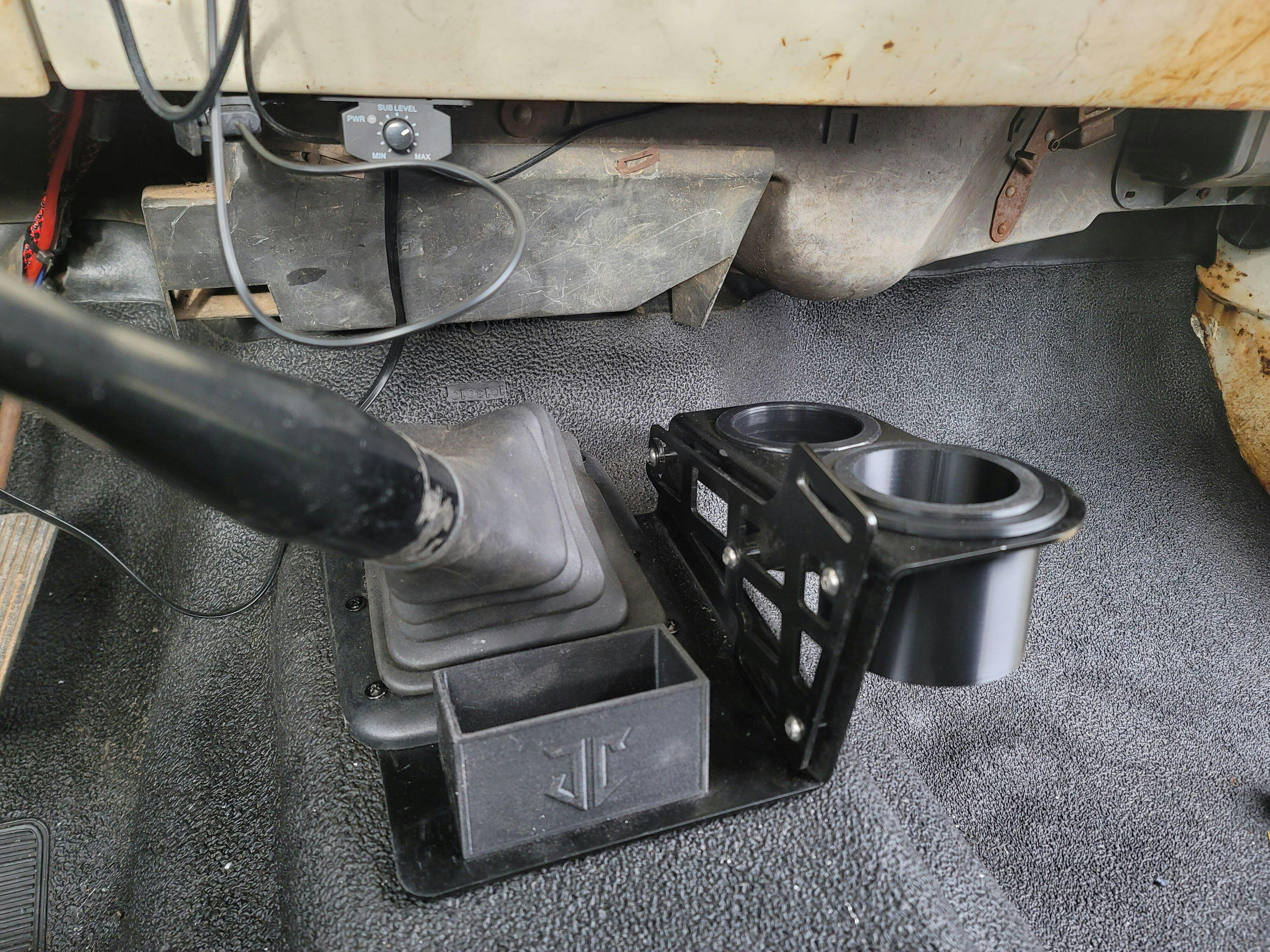 Tired of setting your drinks between your legs in your old Ford? OBS, Bricknose, Dentside and Bullnose! We now have a solution! This cup holder mounts using the existing holes and hardware for your shifter bezel. (Some models will require longer screws, and/or washers). Both cup holder inserts are provided. One is a 3-1/2 opening and the other is 2-5/8. The smaller insert will fit soda cans, the bigger fits most any other size drink.