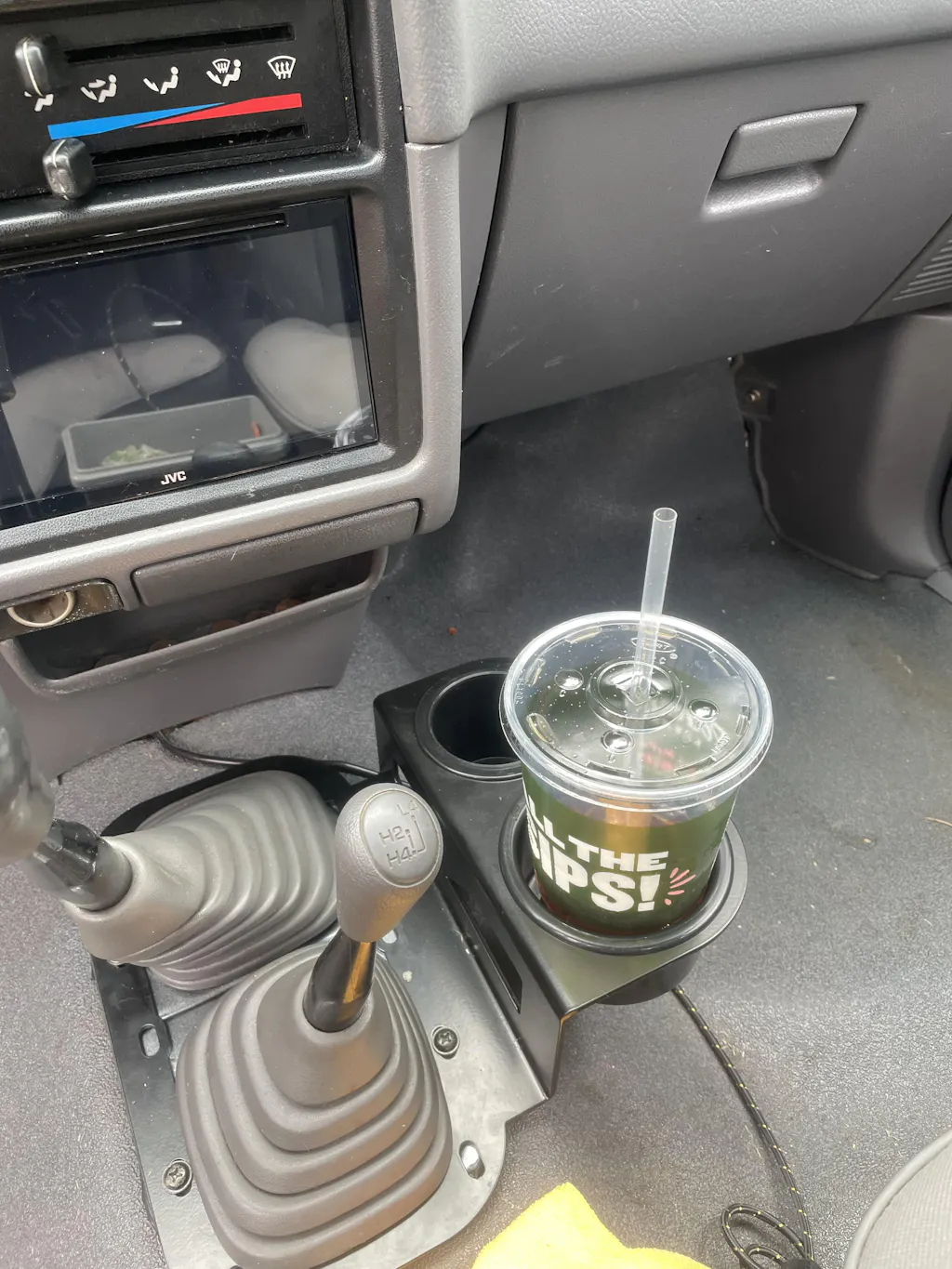 Anyone that has an early 90’s Toyota Pickup knows the original cup holders are flimsy and cover your fan/heat controls when in use. This was easy to install and rock solid. Smaller front holder is perfect for a water bottle and larger holder works for my insulated coffee cup.